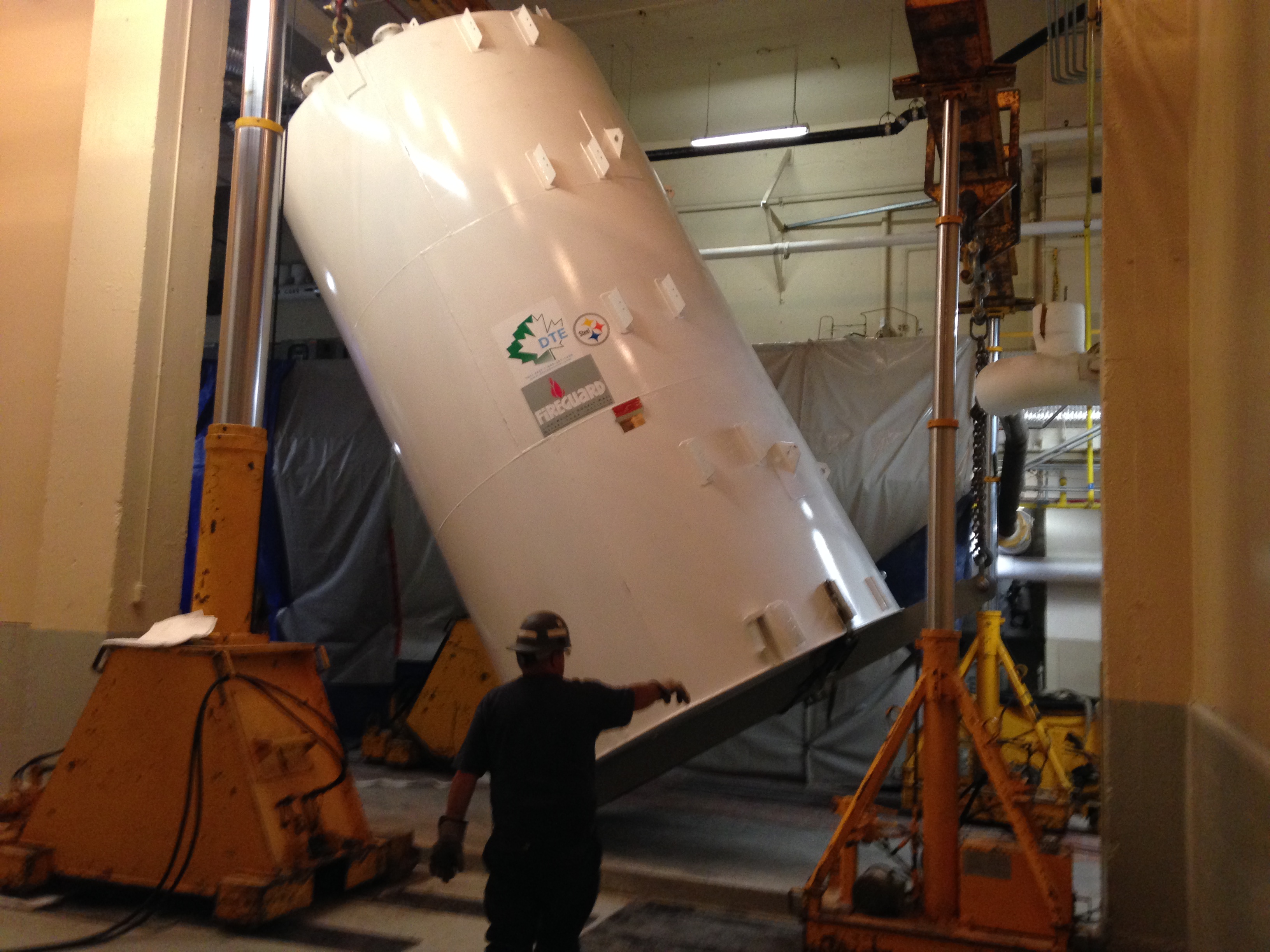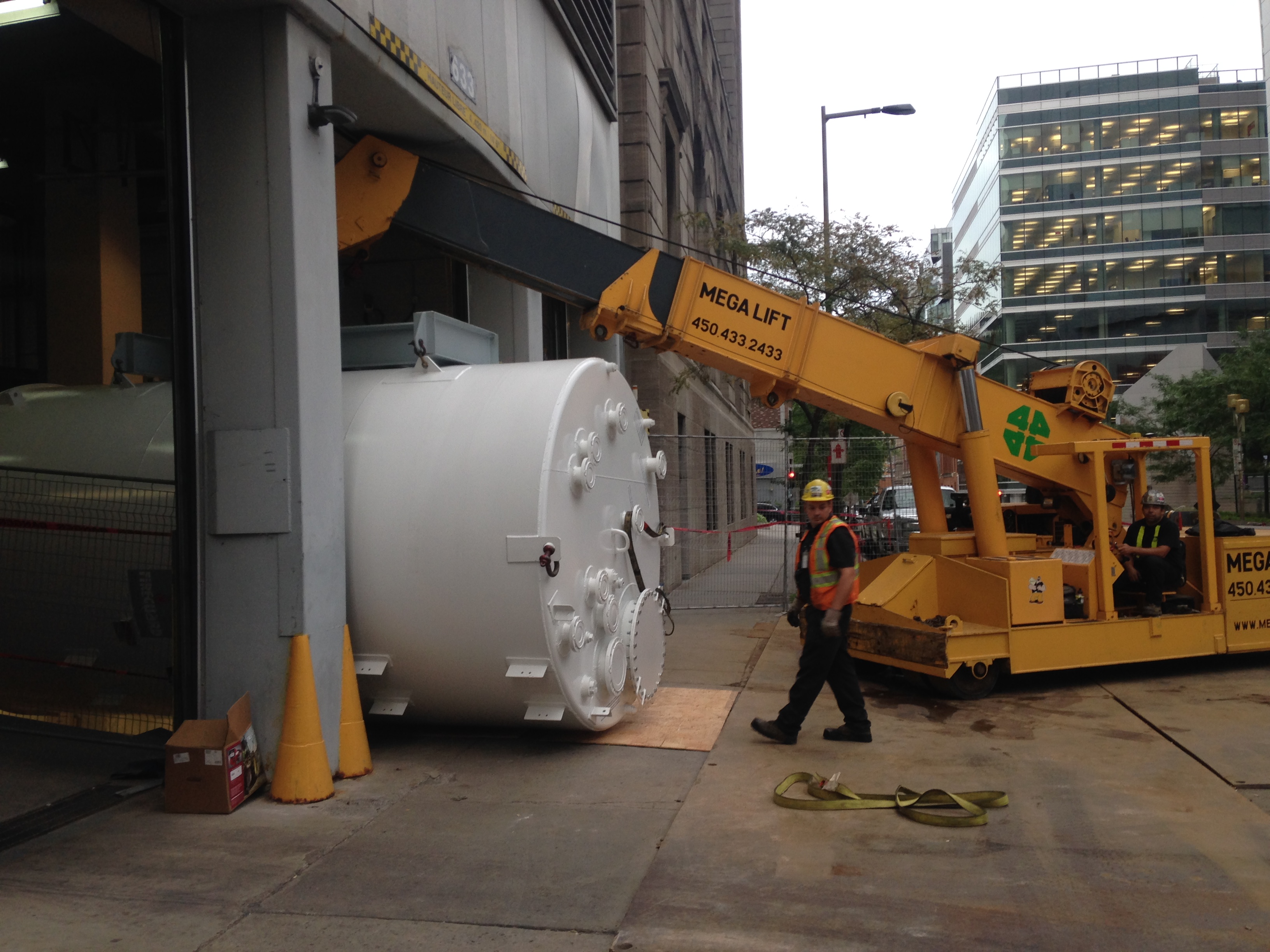 À l’été 2016, Méga Lift a mis en place de quatre réservoirs doubles parois de 24 000 livres au centre-ville de Montréal. L’opération comprenait 2 étapes: descendre les réservoirs avec une Mobilift 75t au travers de deux planchers et, une fois au sous-sol, les relever afin de les mettre dans le bon sens avec nos portiques.